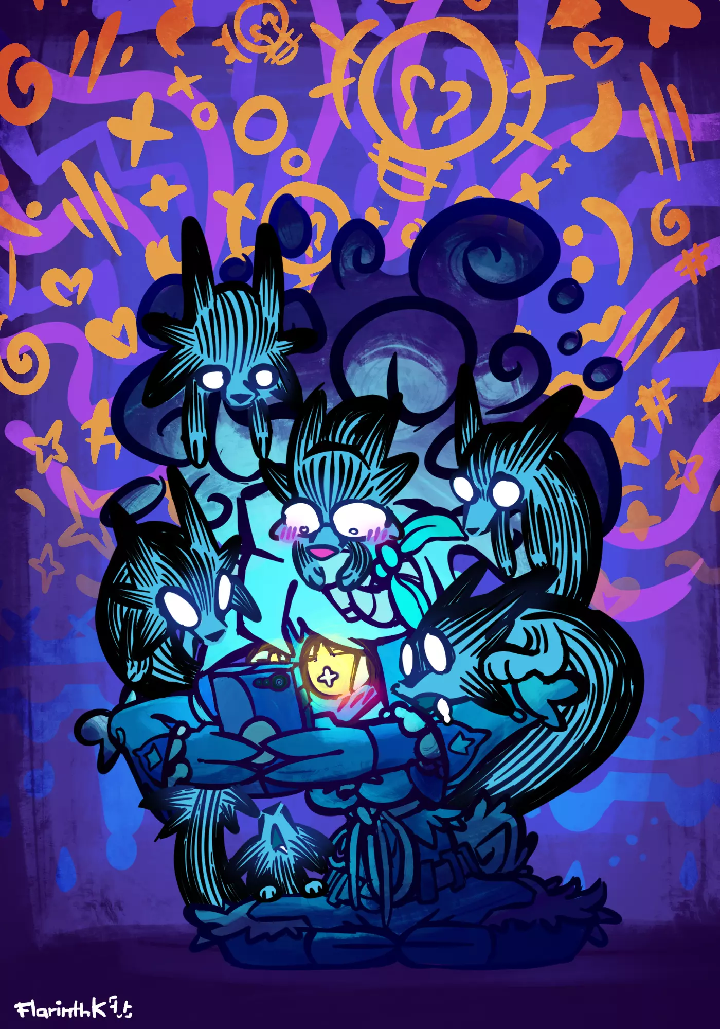 Beyond the turbulent forest of vines is a creature who sits on rocks, playing sounds of the colors that define it’s soul against the heavy grain of chaos. The sounds puncture the very fabric of discord, running from it’s call. Even the chaos itself fears the colorful chaos it created within the creature.